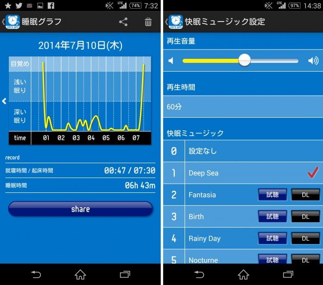 そして、毎日の睡眠状態を記録して、自分がどういったときに睡眠の質が高くて、どういったときに質の悪い睡眠になるか、把握するようにしましょう。睡眠状態の記録は、睡眠計なども発売されていますが、スマートホンの無料アプリでも十分でしょう。管理人が使用しているのは、「快眠サイクル時計」というAndroidアプリです。以下のように、毎日の睡眠レベルを記録したり、入眠しやすくするための快眠ミュージックの設定といった機能があります。